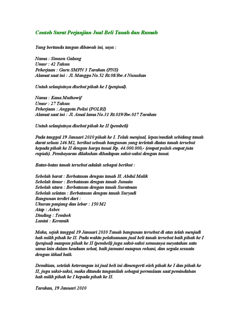 This study describes one of the manuscripts about the. Untuk contoh surat perjanjian, administrasi jual beli/kepemilikan tanah dan pertanahan lainnya. Download as docx, pdf, txt or read online from scribd. Kedua, sah secara hukum jual beli di negara republi. Poin ini pada contoh surat perjanjian jual beli tanah ditujukan untuk pihak pertama agar mengukuhkan dan memberi kejelasan bahwa rumah yang hendak dijual.